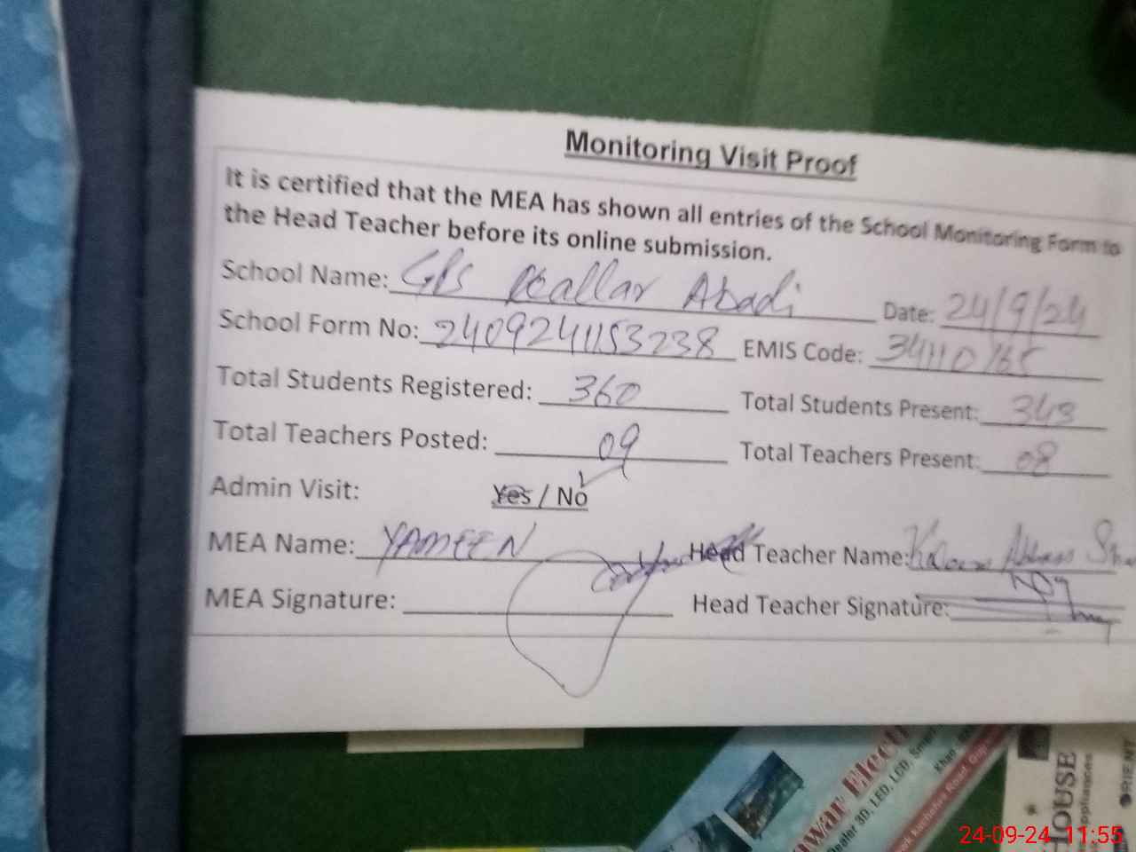 | Attendance Register | Head Teacher | MEA with School | Visit Proof |
