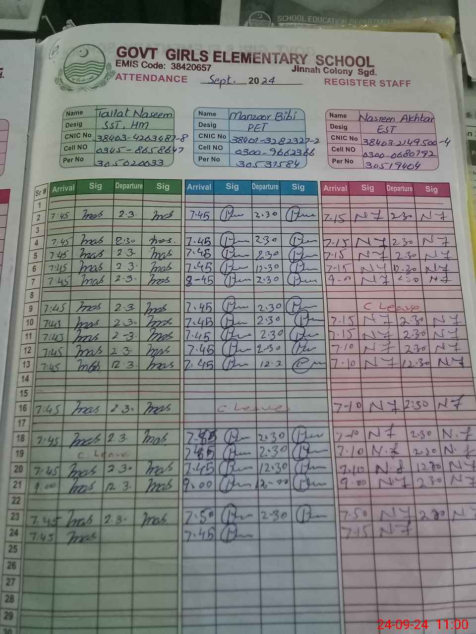 | CNIC | Full Name | Designation | R/C | Absence during last cal. month |
