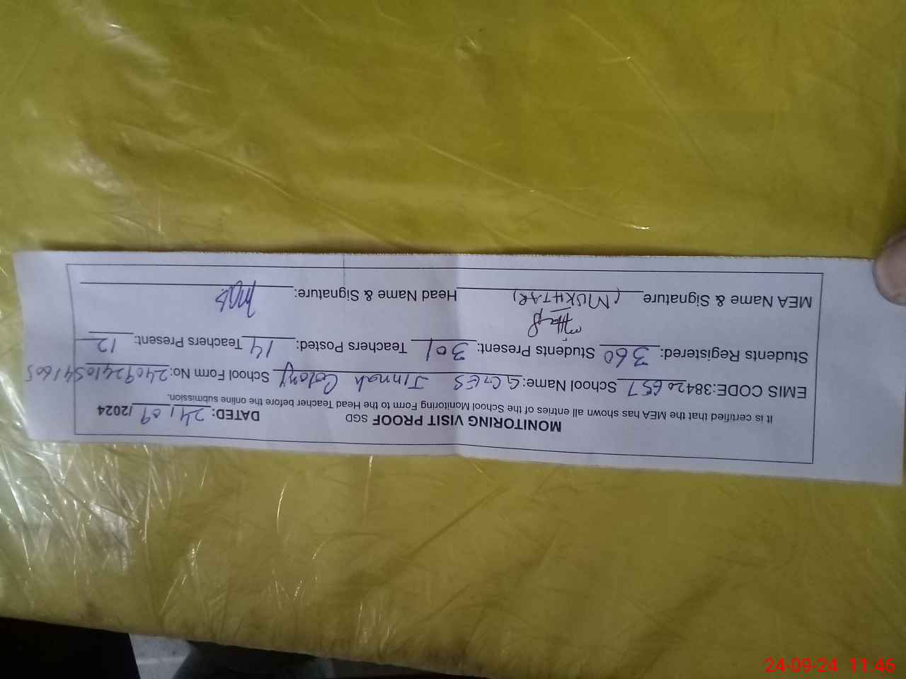 | Attendance Register | Head Teacher | MEA with School | Visit Proof |