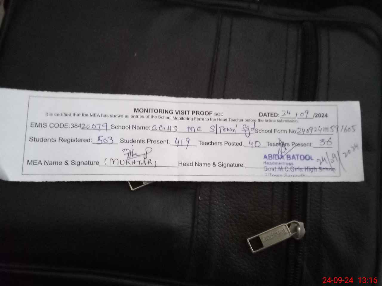 | Monitoring Date: 24-09-2024 | Start Time: 24-09-2024 11:58 AM | End Time: 24-09-2024 01:16 PM | Name of MEA: MU**** AH**** | |