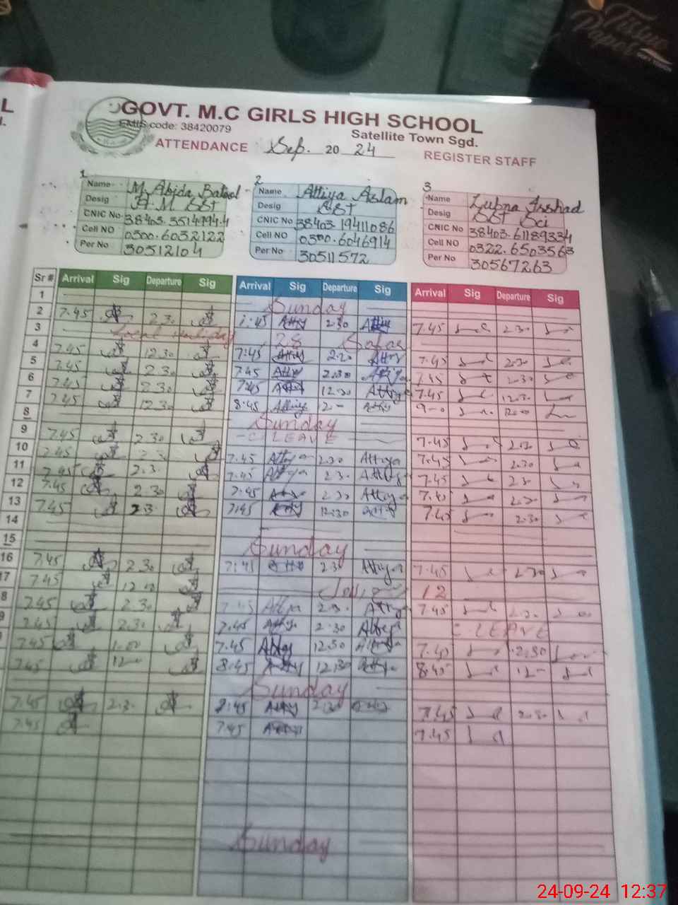 | CNIC | Full Name | Designation | R/C | Absence during last cal. month |