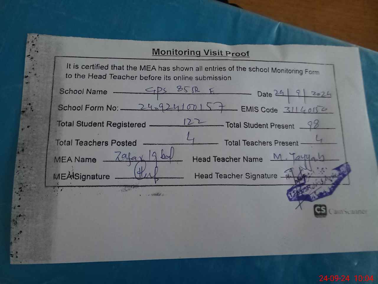 | Attendance Register | Head Teacher | MEA with School | Visit Proof |