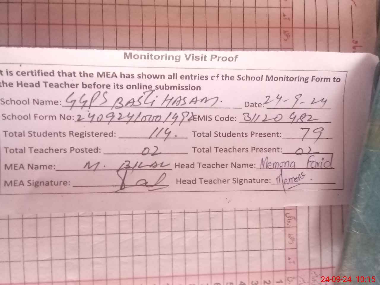 | Attendance Register | Head Teacher | MEA with School | Visit Proof |
