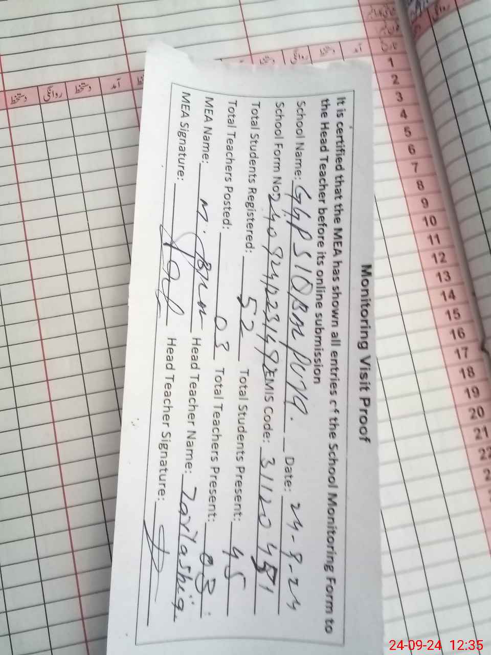 | Attendance Register | Head Teacher | MEA with School | Visit Proof |