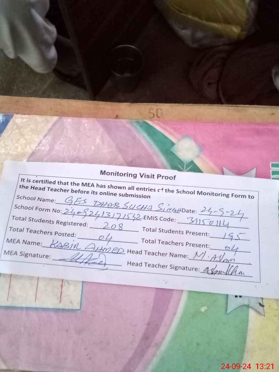 | Attendance Register | Head Teacher | MEA with School | Visit Proof |