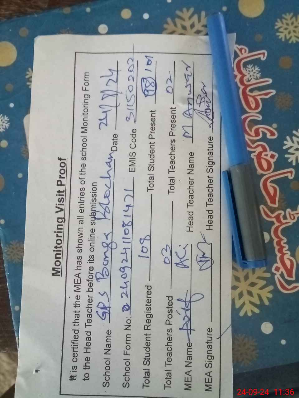 | EMIS Code: 31150202 | Name of School: GPS BONGA BALOCHAN | |||
