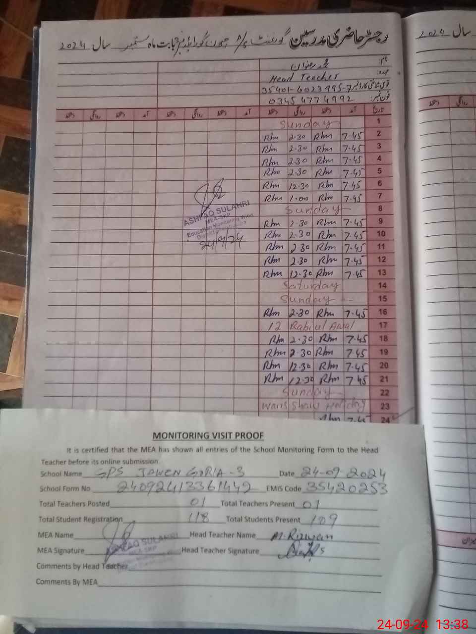 | Attendance Register | Head Teacher | MEA with School | Visit Proof |