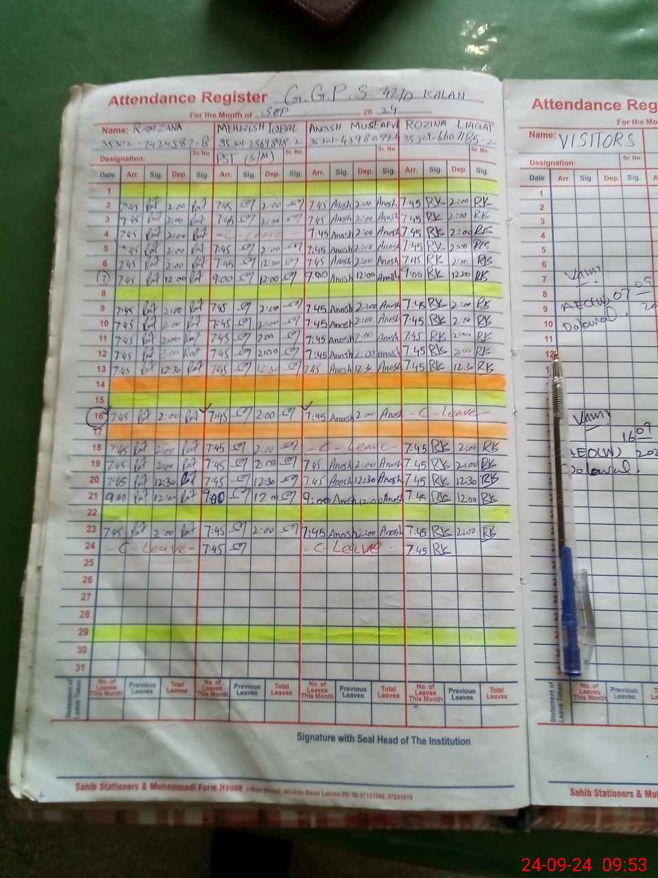 | CNIC | Full Name | Designation | R/C | Absence During Last Calender Month |