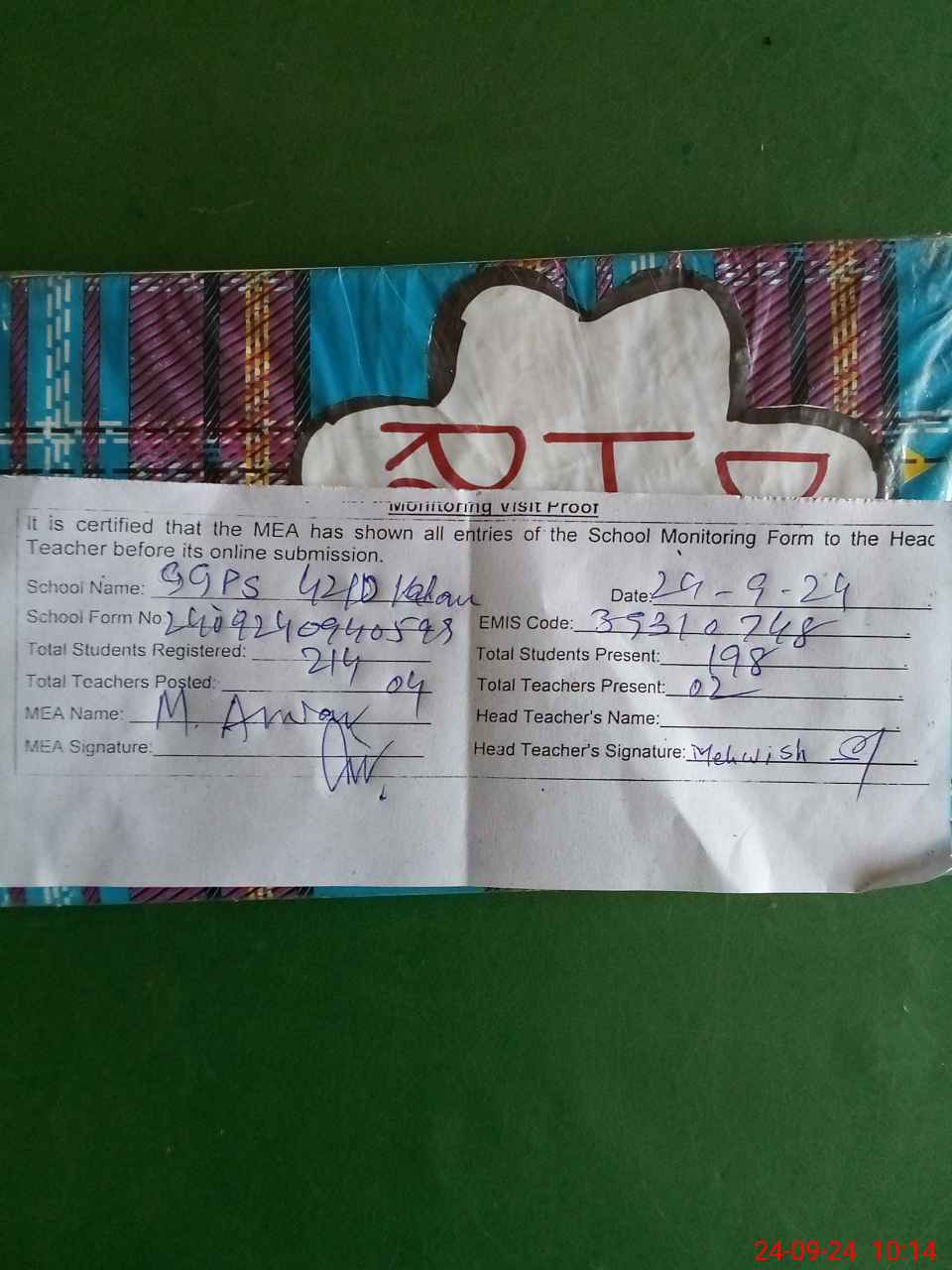| Attendance Register | Head Teacher | MEA with School | Visit Proof |