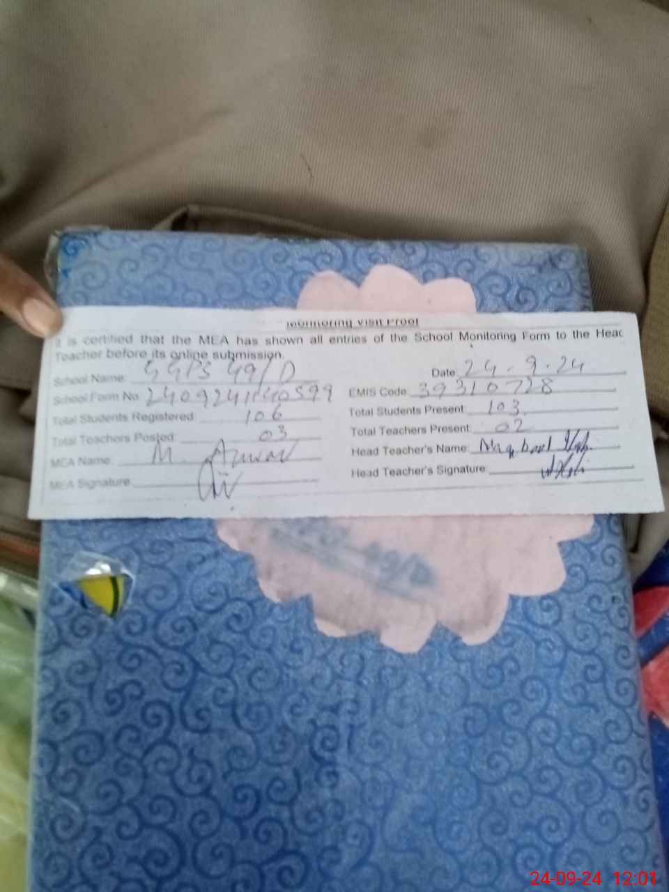 | Attendance Register | Head Teacher | MEA with School | Visit Proof |