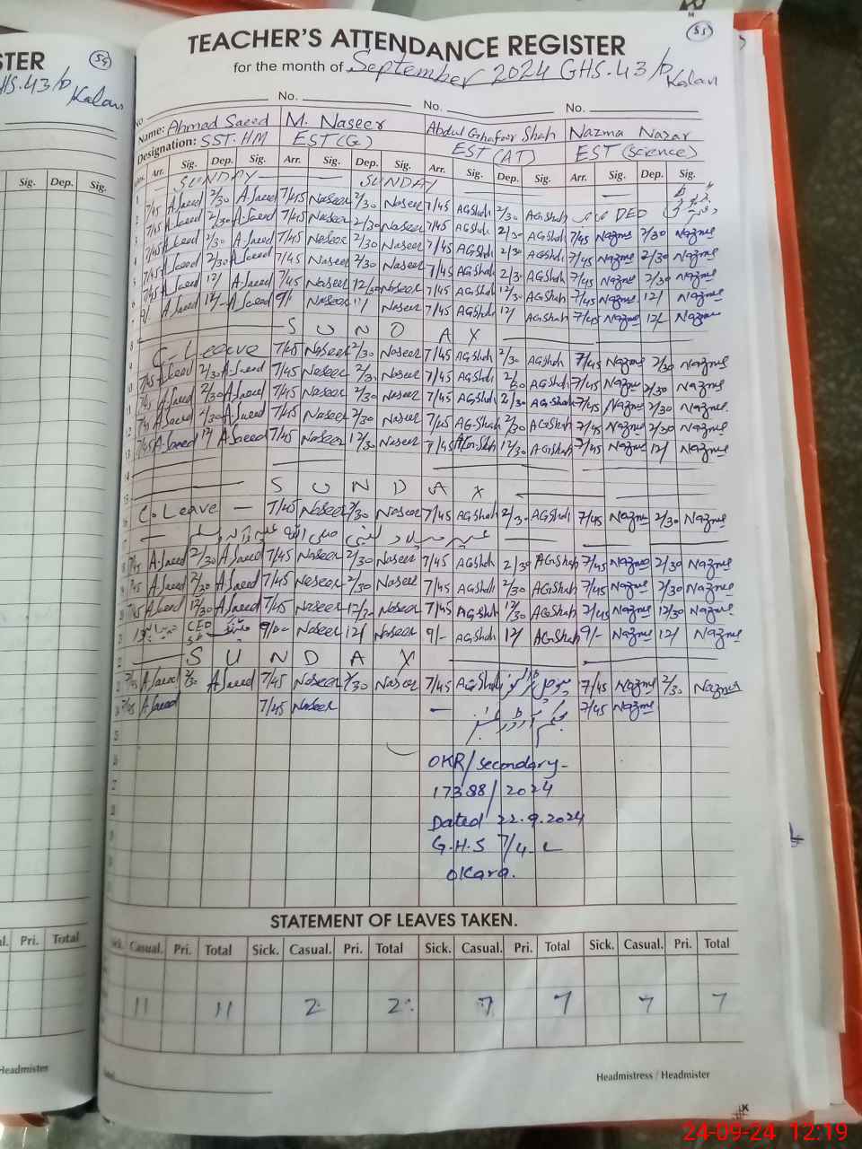 | EMIS Code: 39310094 | Name of School: GHS CHAK 43-D KALAN | |||