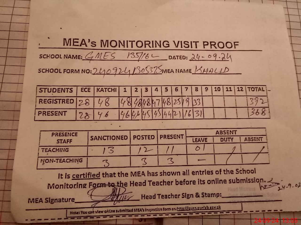 | Attendance Register | Head Teacher | MEA with School | Visit Proof |