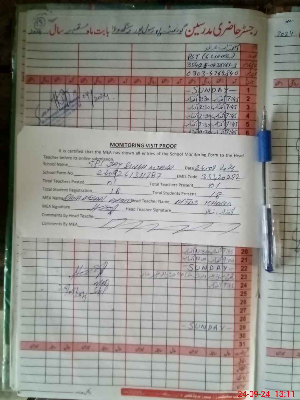 | Attendance Register | Head Teacher | MEA with School | Visit Proof |
