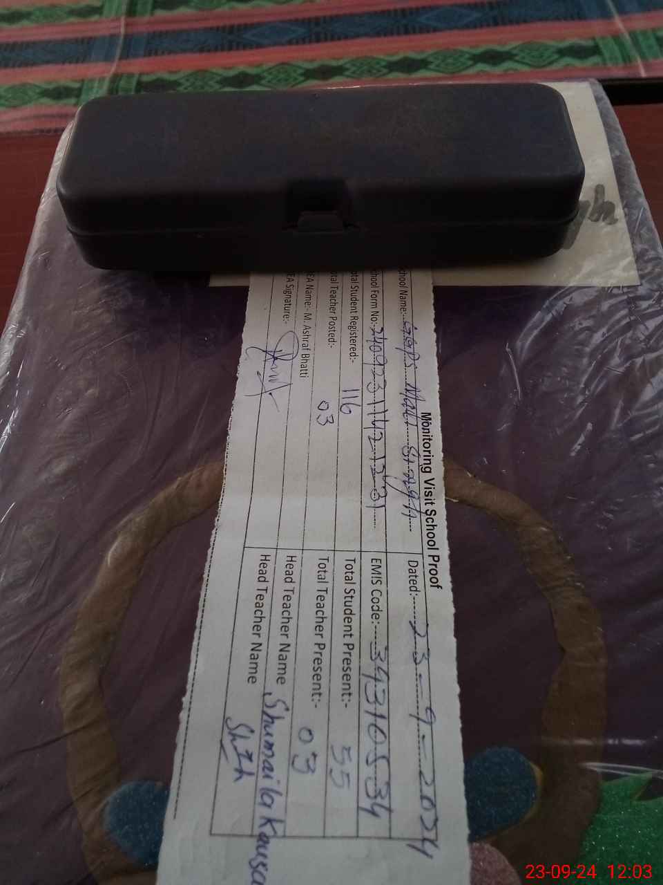| Total no. of Classrooms: 2 No. of Classrooms Used for Teaching: 2 No. of Classrooms Storing Old Furniture, FTBs, etc: 0Comments if Any: No admin visit AEO during last Month August |