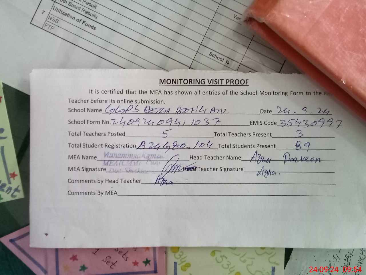 | Attendance Register | Head Teacher | MEA with School | Visit Proof |