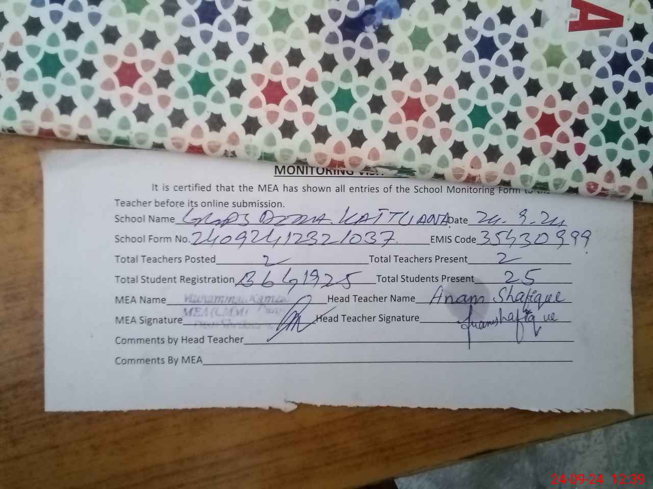 | Certified that this School was Inspected by the Undersigned MEA/DMO Today and the Information Stated Above is as Per Record. | |||||