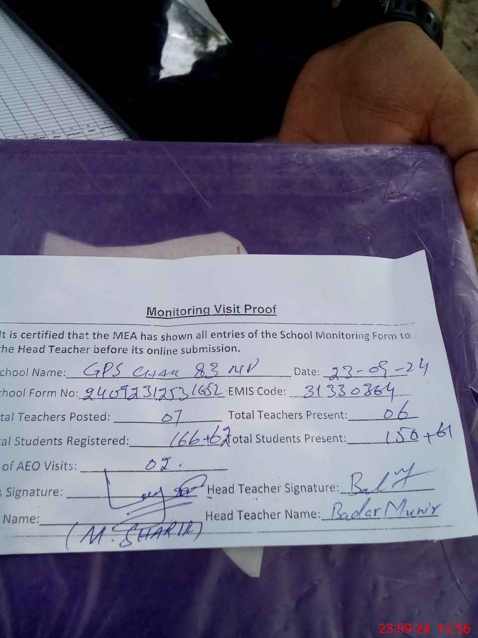 | Attendance Register | Head Teacher | MEA with School | Visit Proof |