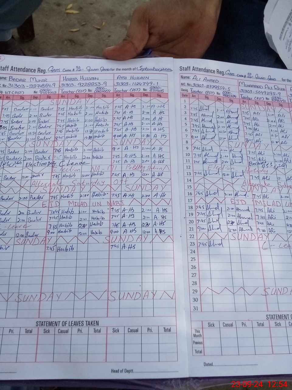 | CNIC | Full Name | Designation | R/C | Absence During Last Calender Month |