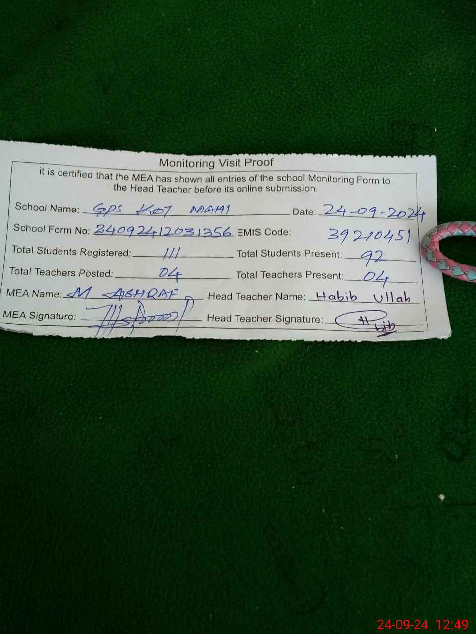| Certified that this School was Inspected by the Undersigned MEA/DMO Today and the Information Stated Above is as Per Record. | |||||