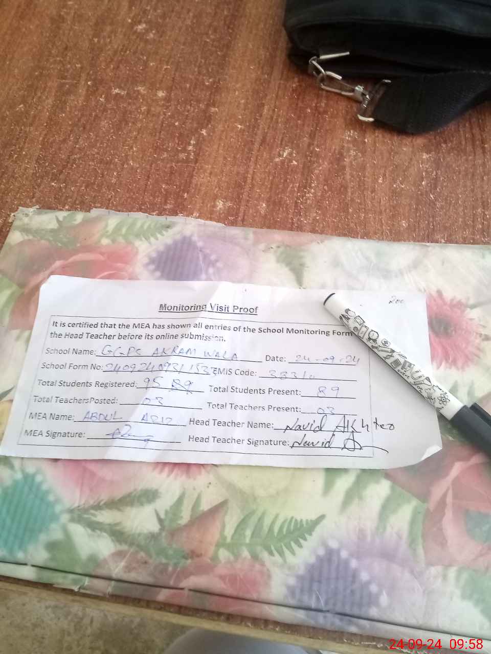 | Attendance Register | Head Teacher | MEA with School | Visit Proof |