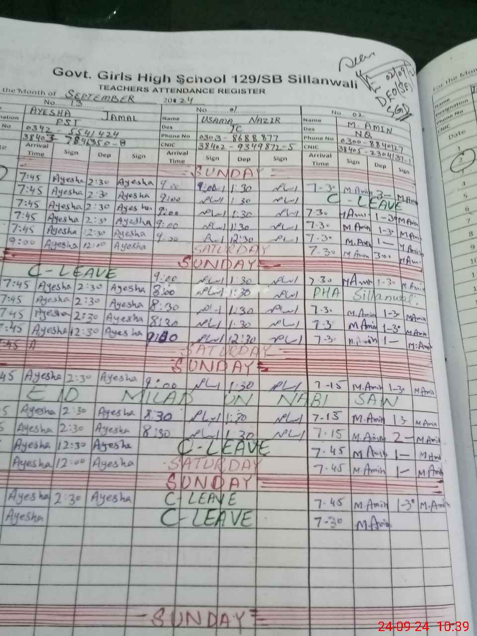 | CNIC | Full Name | Designation | R/C | Absence during last cal. month |