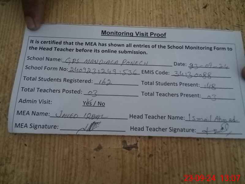| Certified that this School was Inspected by the Undersigned MEA/DMO Today and the Information Stated Above is as Per Record. | |||||