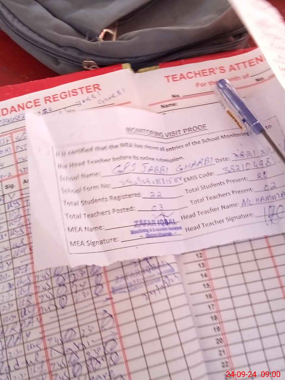 | Attendance Register | Head Teacher | MEA with School | Visit Proof |