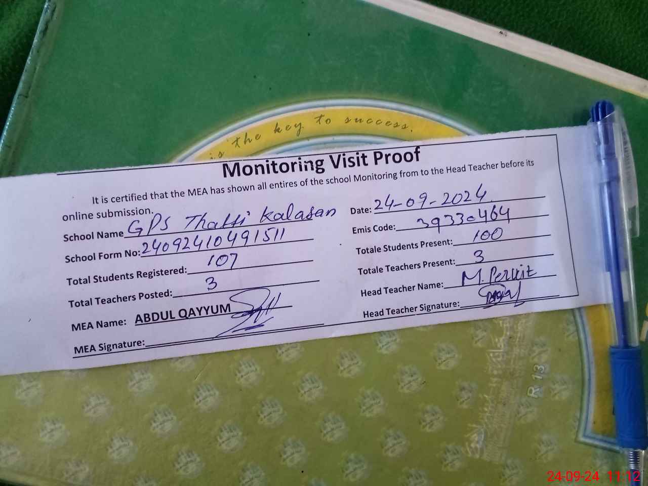 | Attendance Register | Head Teacher | MEA with School | Visit Proof |