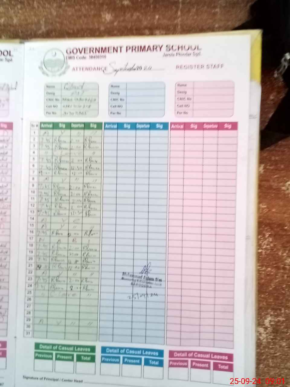 | CNIC | Full Name | Designation | R/C | Absence during last cal. month |