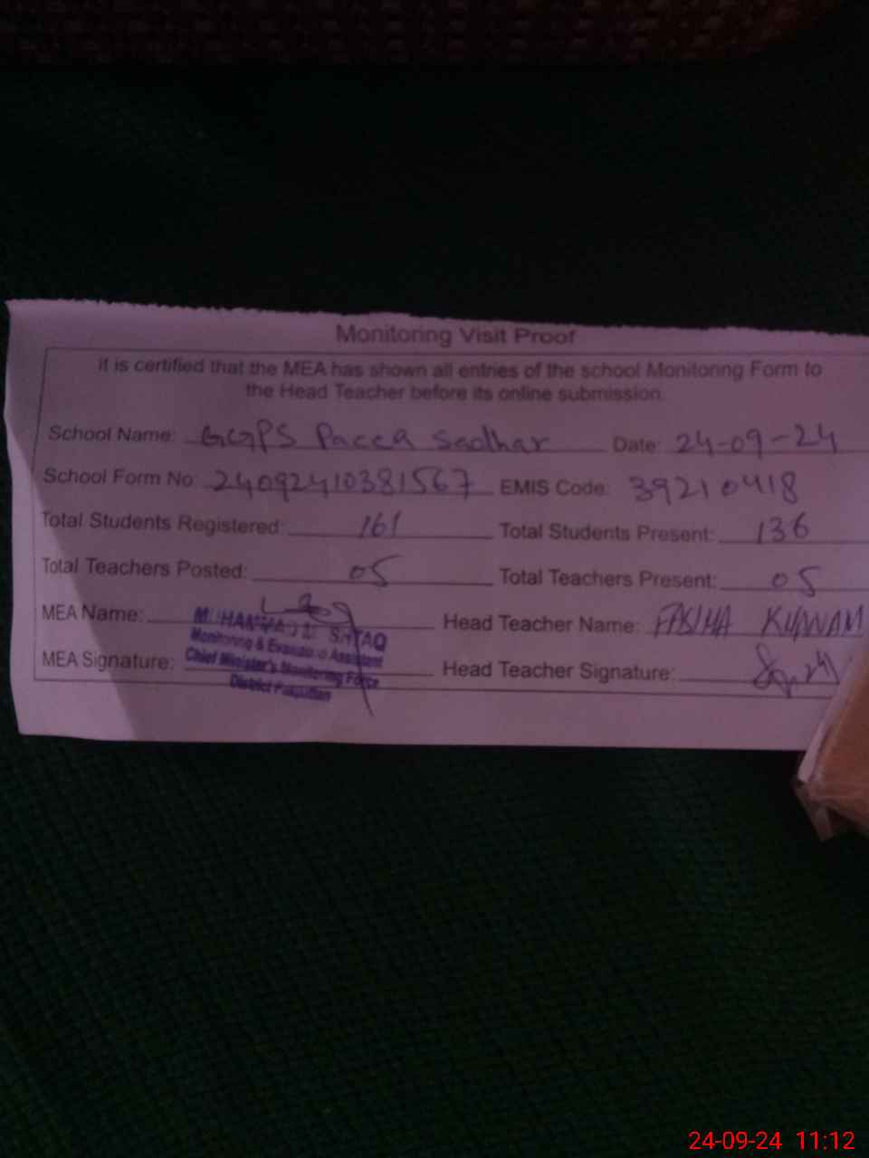| Attendance Register | Head Teacher | MEA with School | Visit Proof |