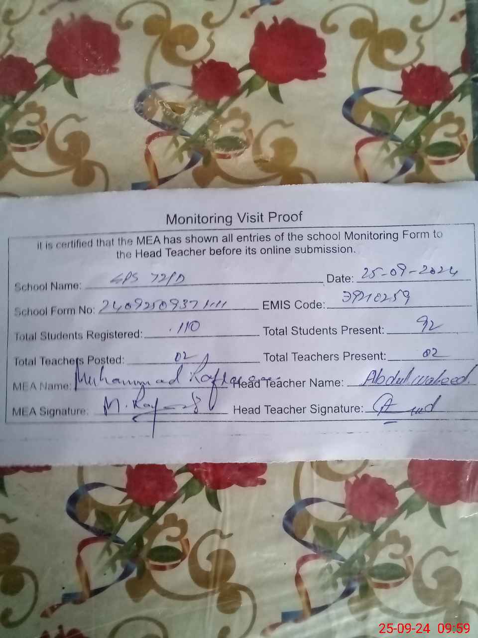 | EMIS Code: 39210259 | Name of School: GPS CHAK NO. 72 D | |||