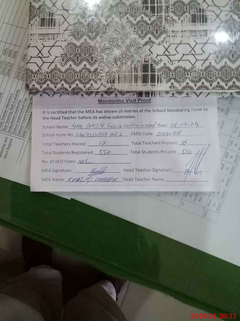 | Attendance Register | Head Teacher | MEA with School | Visit Proof |