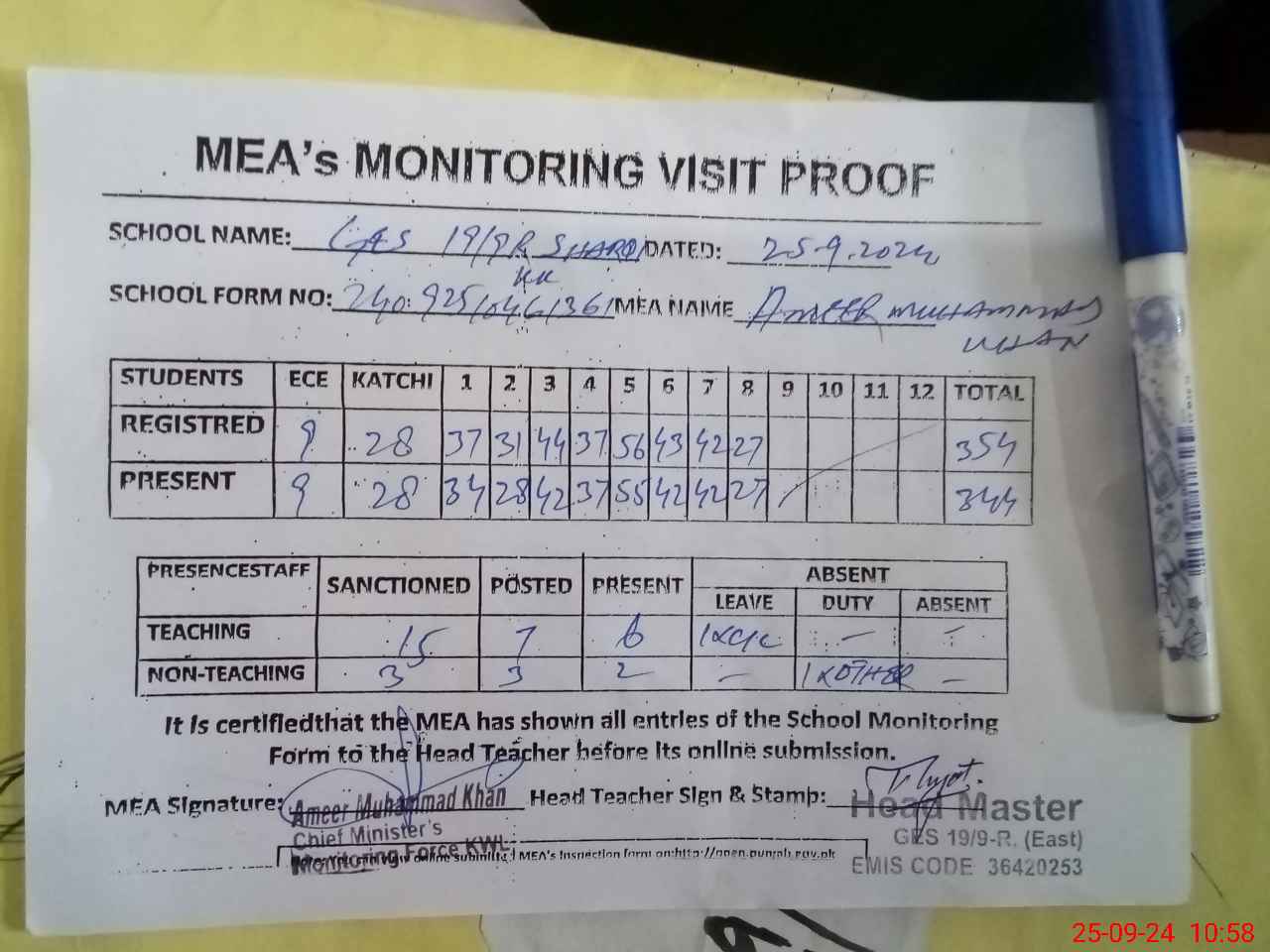 | Attendance Register | Head Teacher | MEA with School | Visit Proof |