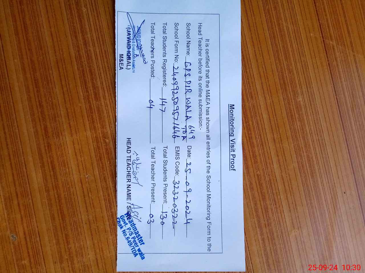 | Attendance Register | Head Teacher | MEA with School | Visit Proof |