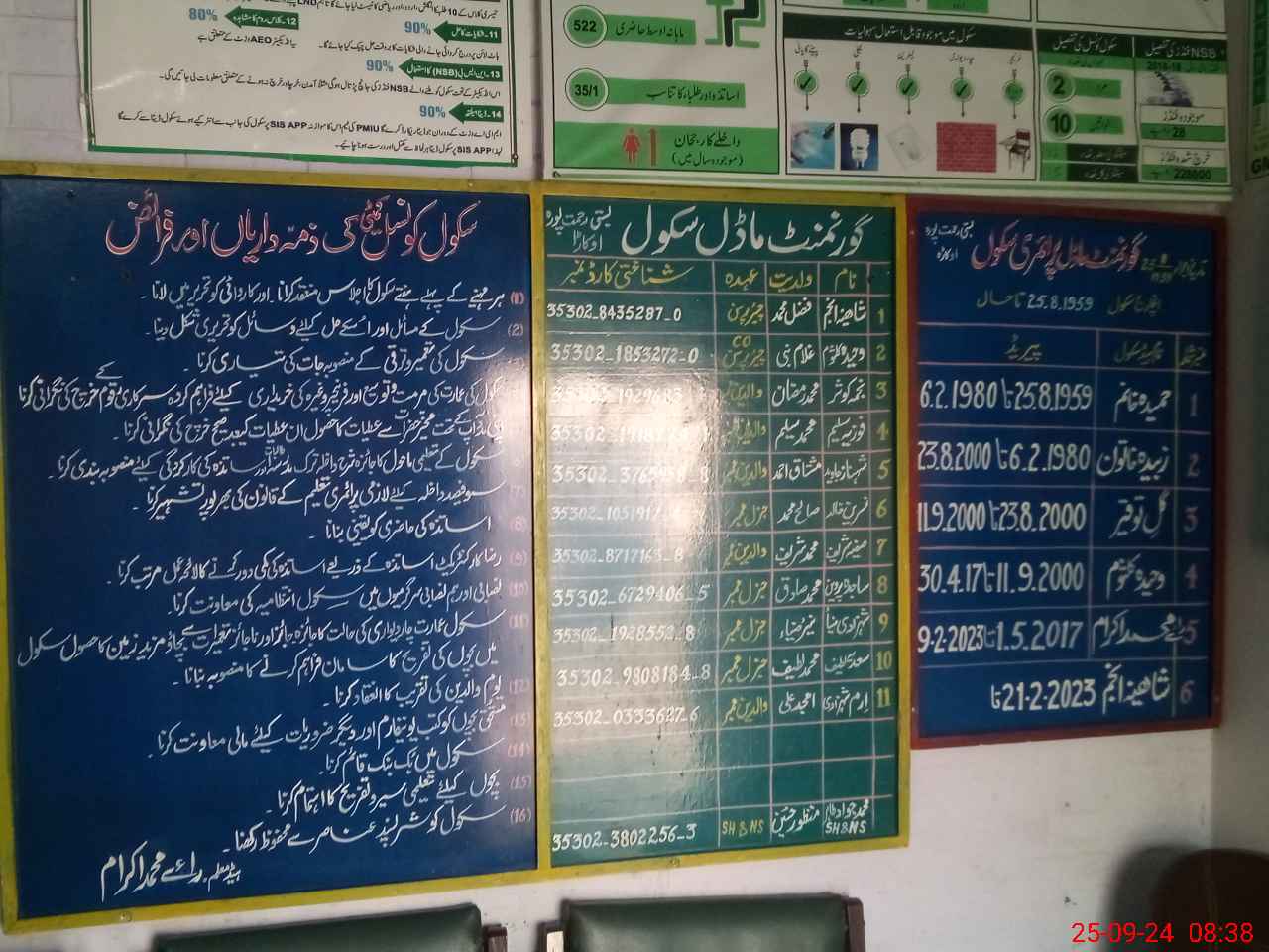 | Total no. of Classrooms: 15 No. of Classrooms Used for Teaching: 13 No. of Classrooms Storing Old Furniture, FTBs, etc: 0Comments if Any: Nominal roll for online attendance found contrary to current students records Head teacher stated that all enrolled students provided with free tax books according to current enrollment Form D3 not available |