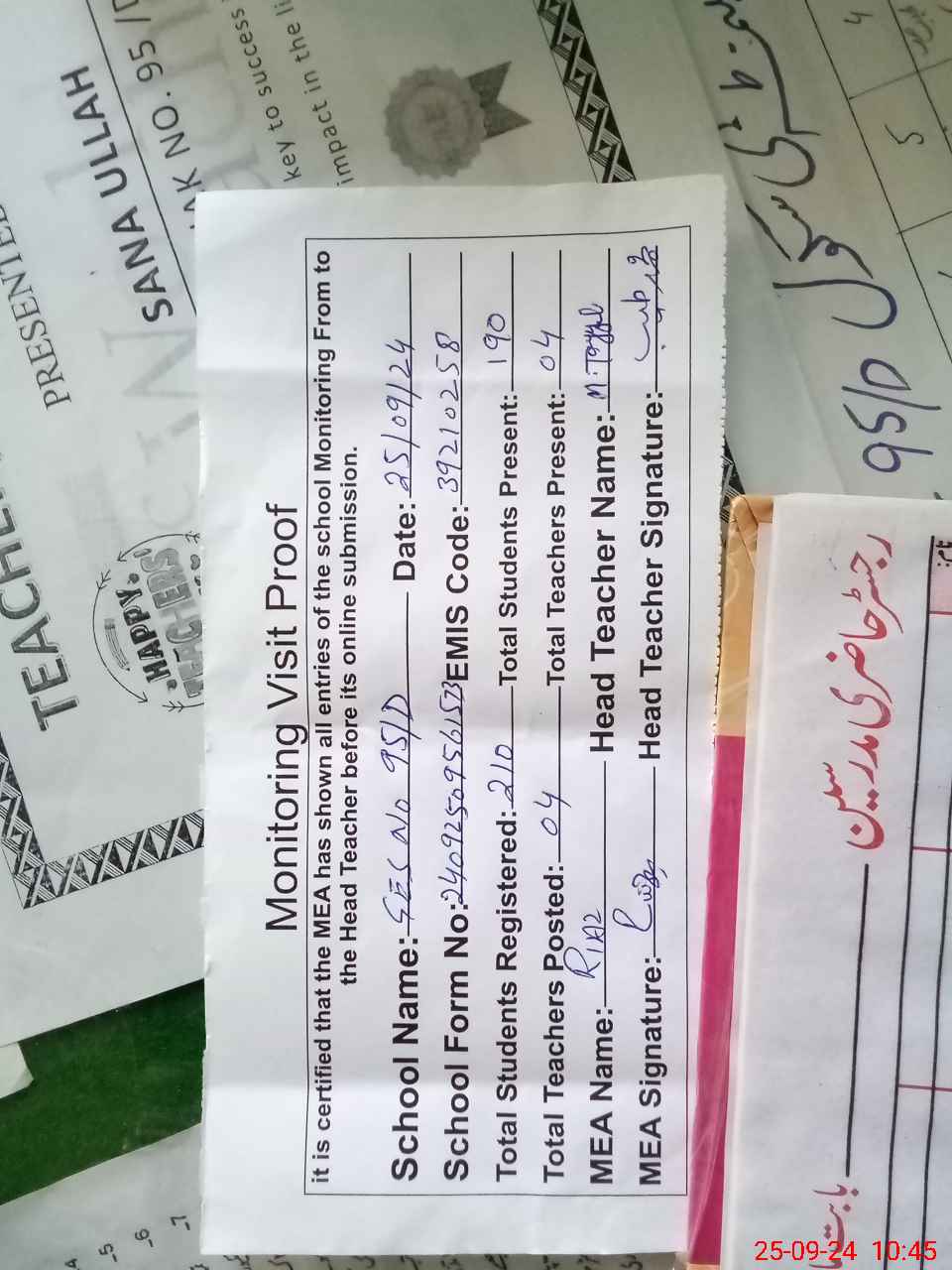 | Attendance Register | Head Teacher | MEA with School | Visit Proof |