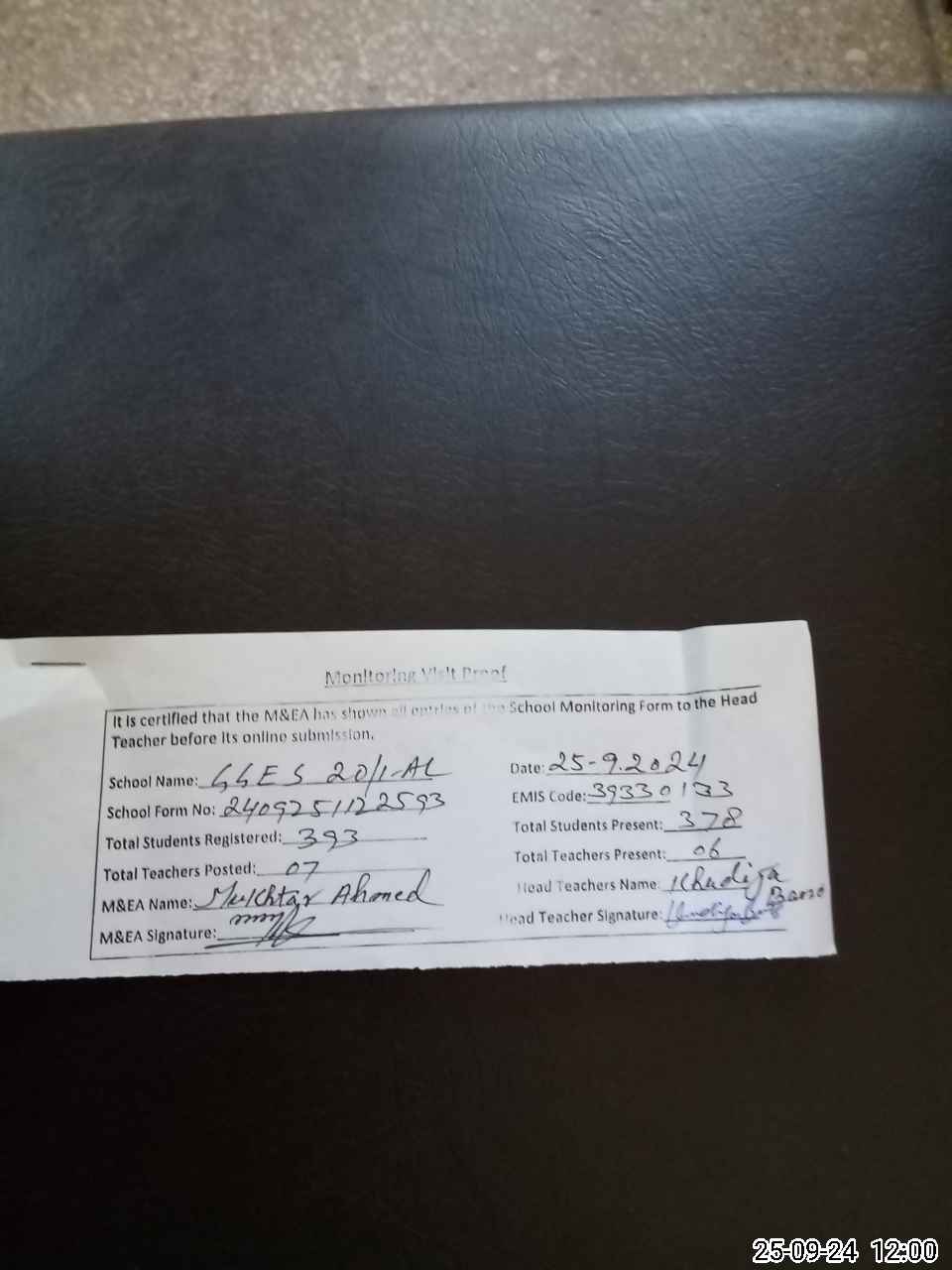 | Attendance Register | Head Teacher | MEA with School | Visit Proof |