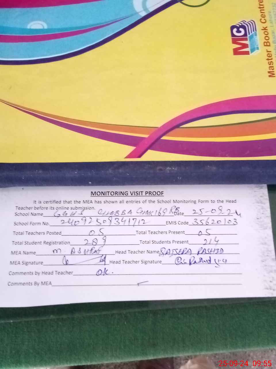 | Attendance Register | Head Teacher | MEA with School | Visit Proof |