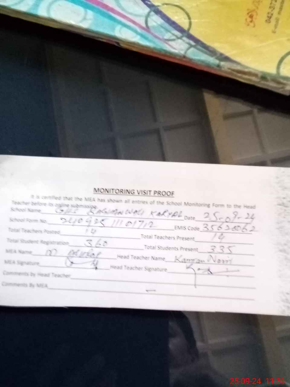 | Attendance Register | Head Teacher | MEA with School | Visit Proof |