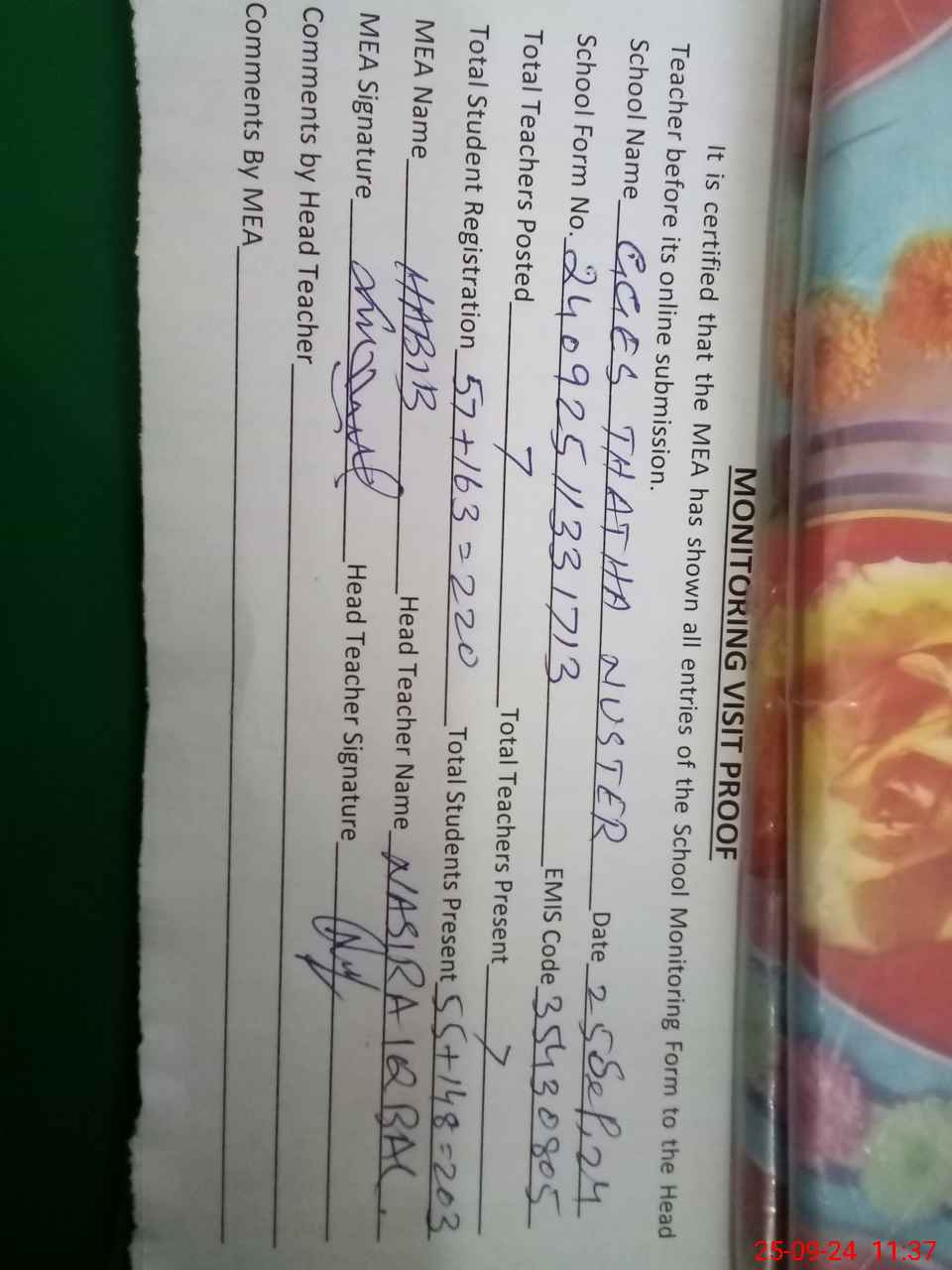 | Attendance Register | Head Teacher | MEA with School | Visit Proof |