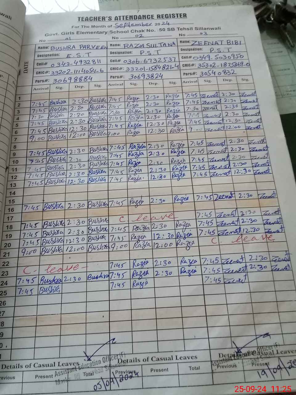| CNIC | Full Name | Designation | R/C | Absence during last cal. month |