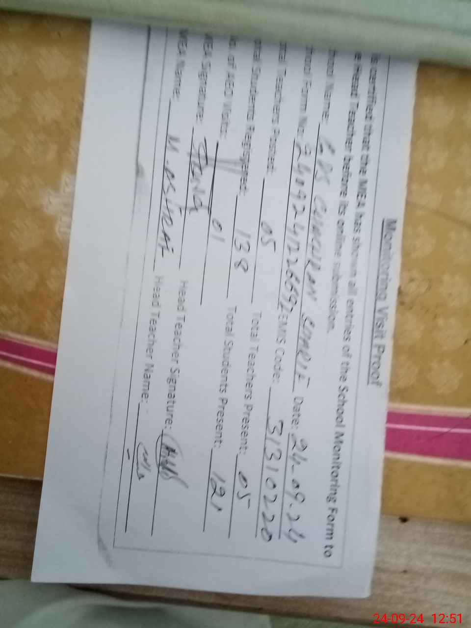 | Attendance Register | Head Teacher | MEA with School | Visit Proof |