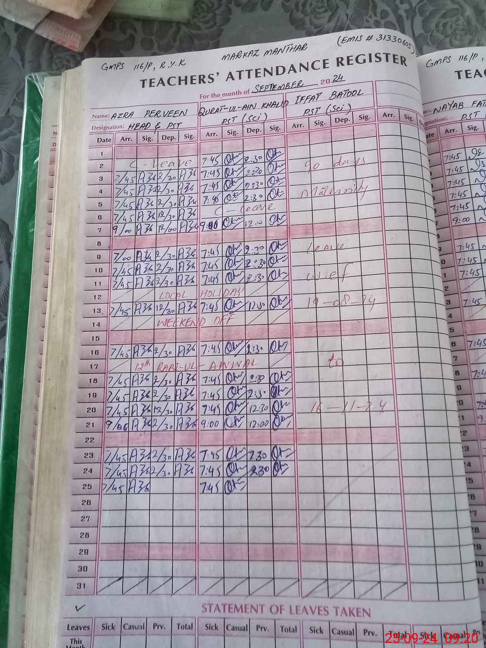 | Leave | Duty | Absent | Maternity | Medical | Ex- Pak |