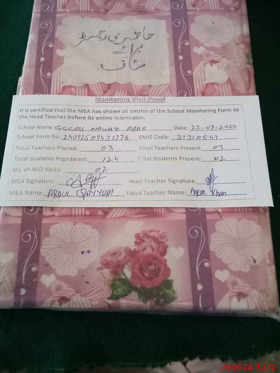 | Attendance Register | Head Teacher | MEA with School | Visit Proof |