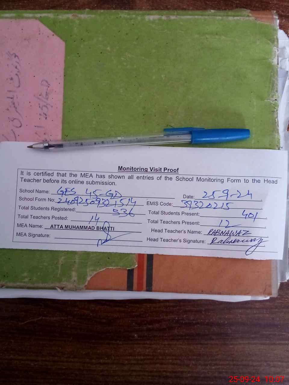 | EMIS Code: 39320215 | Name of School: GHS CHAK 45/G.D | |||