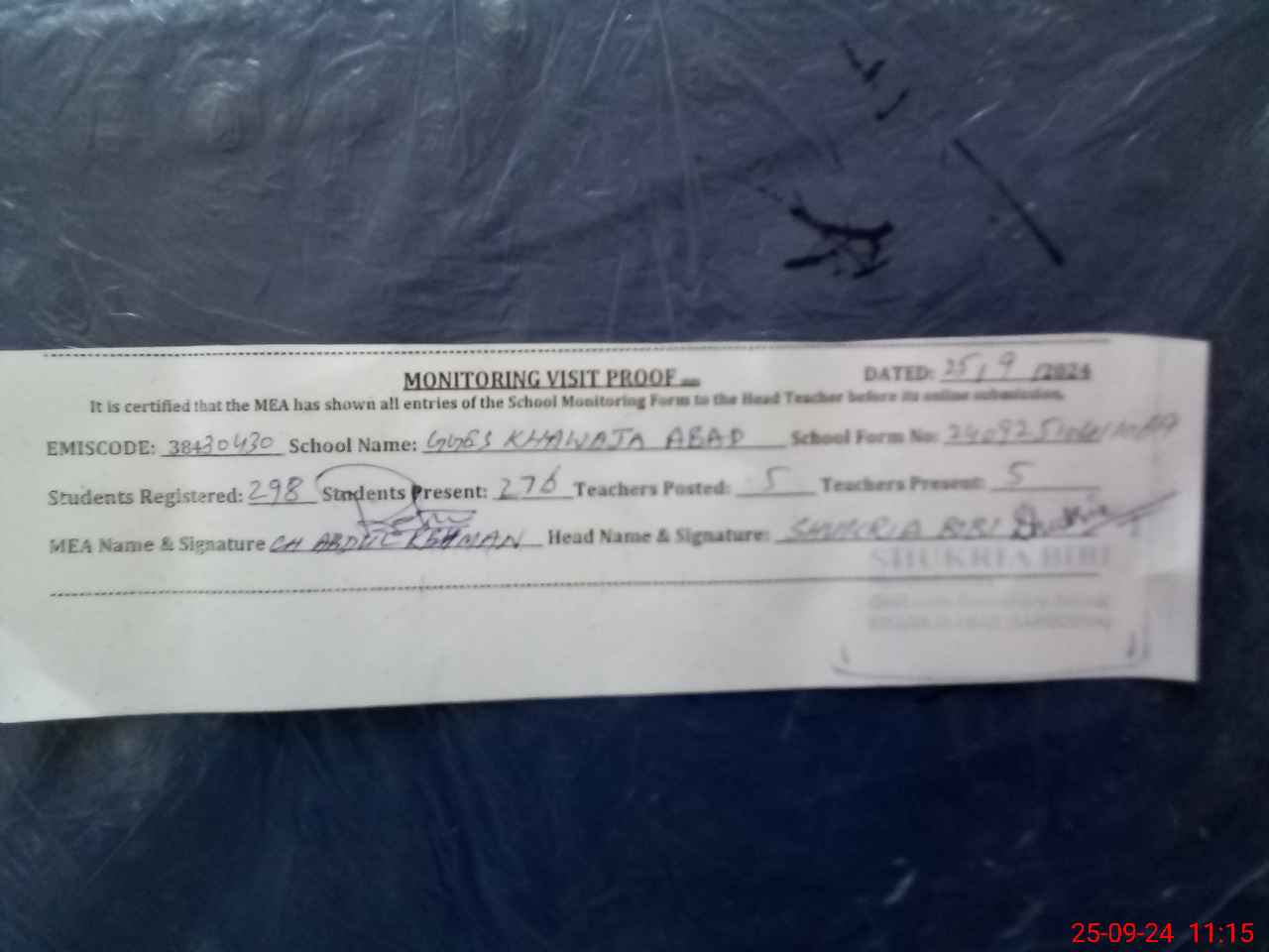 | Certified that this School was Inspected by the Undersigned MEA/DMO Today and the Information Stated Above is as Per Record. | |||||