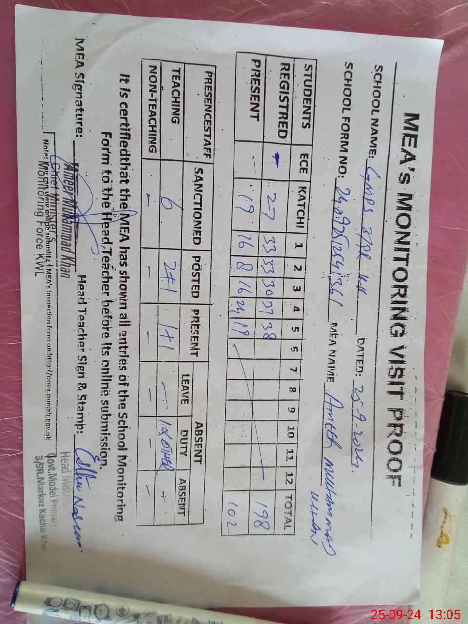 | Attendance Register | Head Teacher | MEA with School | Visit Proof |
