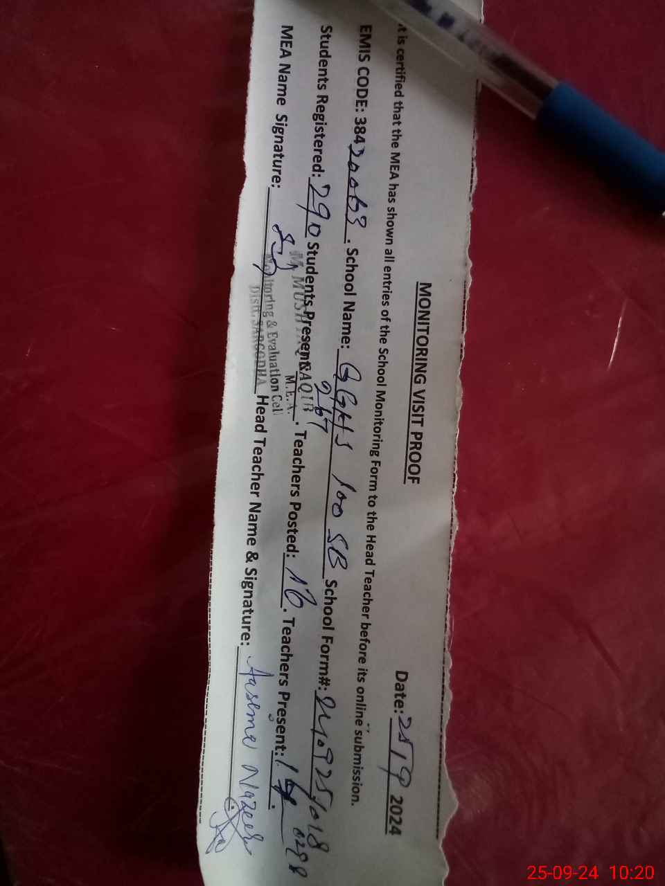 | EMIS Code: 38420063 | Name of School: GGHS CHAK NO.100 SB | |||
