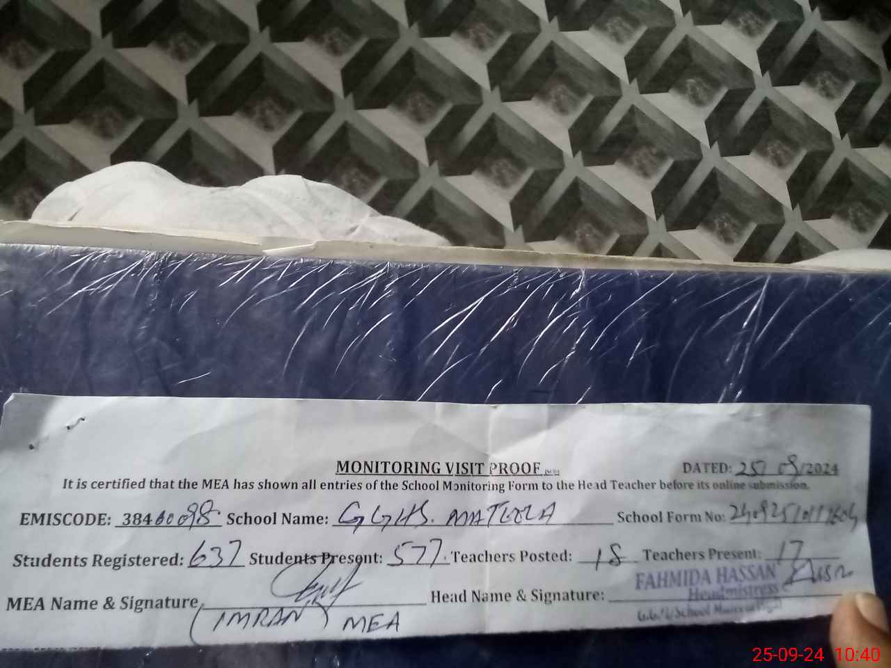 | Certified that this School was Inspected by the Undersigned MEA/DMO Today and the Information Stated Above is as Per Record. | |||||