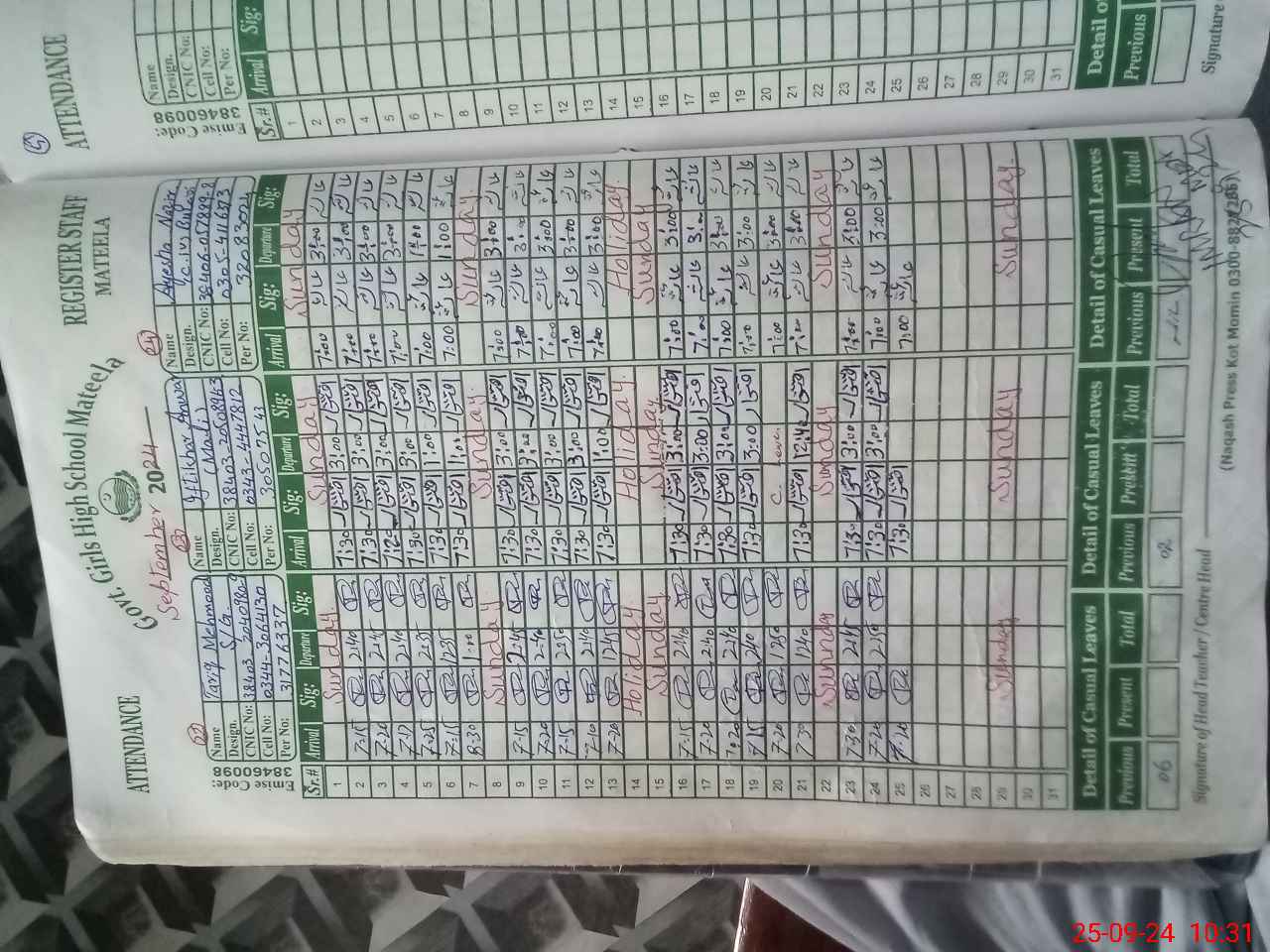 | CNIC | Full Name | Designation | R/C | Absence During Last Calender Month |